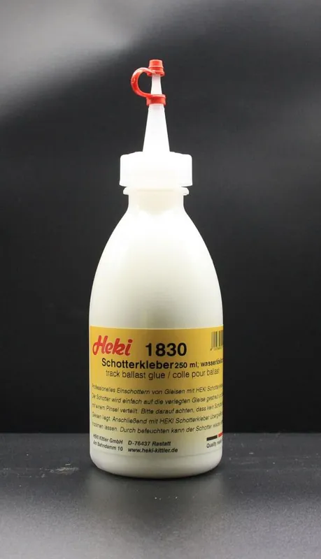 Professionelles Einschottern von Gleisen mit HEKI Schotterkleber. Der Schotter wird einfach auf die verlegten Gleise gestreut und danach mit einem Pinsel verteilt. Bitte darauf achten, dass kein Schotter auf den Gleisen liegt. Anschließend mit dem Schotterkleber übergießen und trocknen lassen. Da der Schotter wasserlöslich ist, kann er durch befeuchten wieder entfernt werden, so dass die Gleise beim Umbau wieder verwendet werden können.