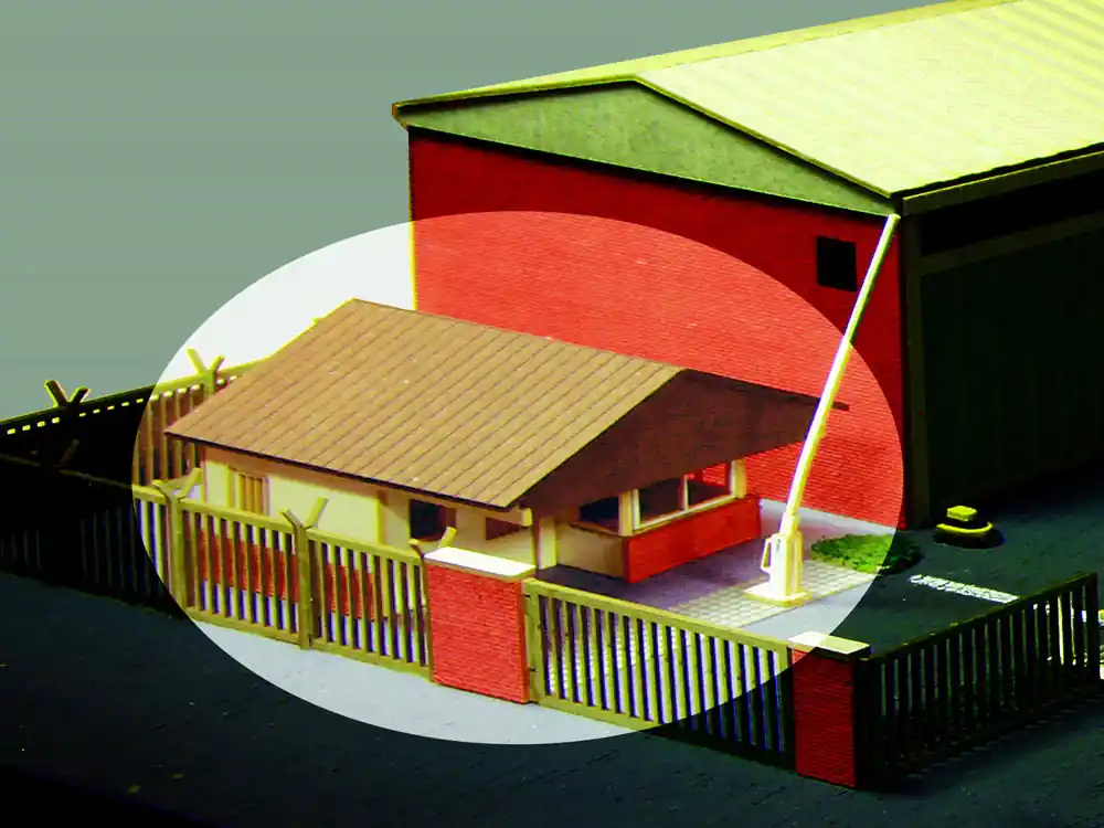 Lasercut Bausatz Hauptwache (oder auch als ziviles Pförtnerhäuschen nutzbar), natürlich ohne Figuren, Fahrzeuge und Auschmückungsdetails. Maße: 53 x 55 x 30 mm
