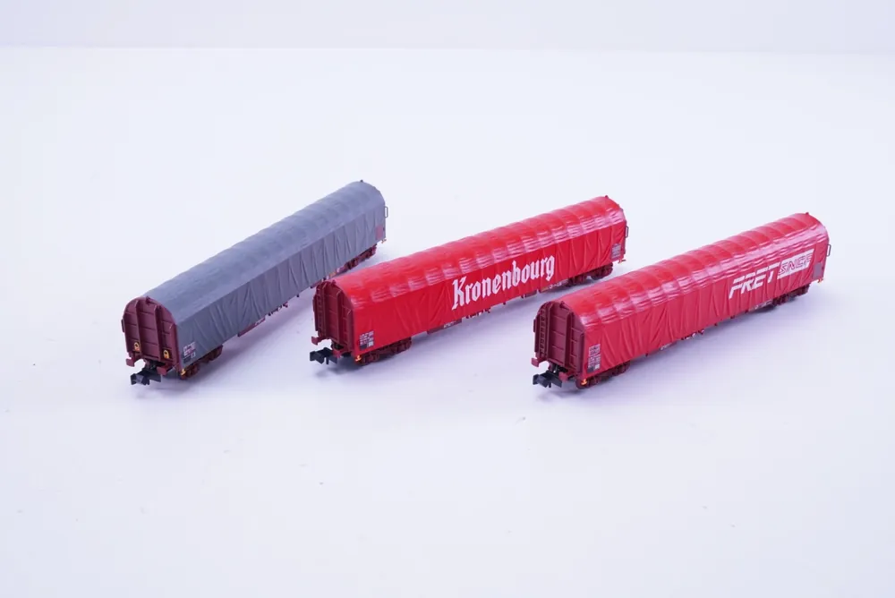Preisreduziert (RBT273) Minitrix 15115 Schiebeplanenwagen-Set „Kronenbourg“ „FRET SNCF“ SNCF, DC, N, OVP – Modellbahn Rhein-Main