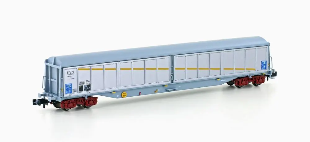 ART.NR.: H23443SCHIEBEWANDWAGEN HABIS SNCF/EVS, EP.IV-V1975 erteilte die SBB einen Auftrag zum Bau von 100 vierachsigen Schiebewandwagen an die Schweizer Schindler Waggon AG. Während die Konzeption mit den vierteiligen Schiebewänden beibehalten wurde, fiel die gesamte Konstruktion um einiges kräftiger aus als die der in Frankreich gebauten Vorgängermodelle.