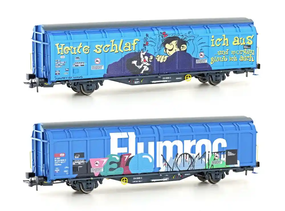 Sehr zum Ärger der Bahn werden jedes Jahr tausende Wagen und Triebfahrzeuge mit Graffitis überzogen – allerdings muss man aber auch zugeben, finden sich immer wieder auch Motive, die zum Schmunzeln oder auch Nachdenken anregen. Mit einer Serie von großflächigen Motiven sind zahlreiche Schiebewandwagen der Bauart Hbbillns der SBB verziert worden. Mit der Serie „Zukunft ist Luxus“ entstanden verschiedene Motive rund um den Kapitalismus, Flüchtlingskrise und sogenannten First World Problems. Beim Besprühen der „Wholecars“ werden bewusst alle Anschriftenfelder vom Künstler frei gelassen, damit steigt nämlich die Chance, dass das Graffiti nicht entfernt wird.Jeder Schiebewandwagen ist von beiden Seiten absolut authentisch und vorbildgetreu bedruckt.Modelleigenschaften:-Neukonstruktion -Berücksichtigung der Bauartunterschiede z.B. Türmechanismus (DB/SBB), verschiedene GPS Antennen, etc.-Angesetzte Ätz-Teile, filigrane Griffstange-Metallchassis mit leichtlaufenden Achsen-Kinematik Mit NEM-Kupplungsaufnahme
